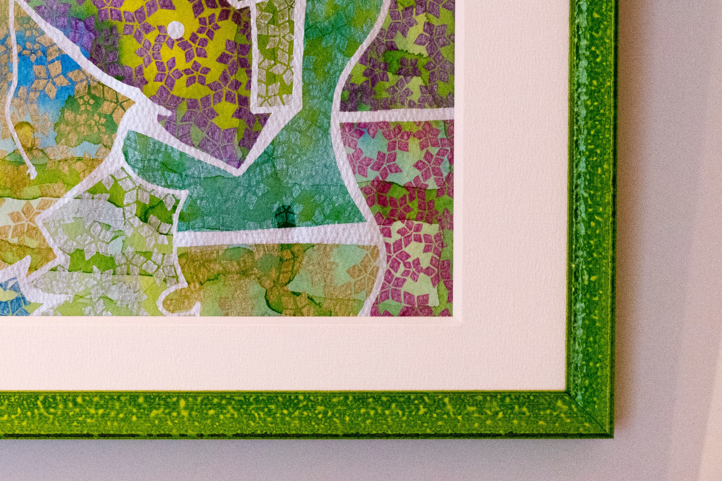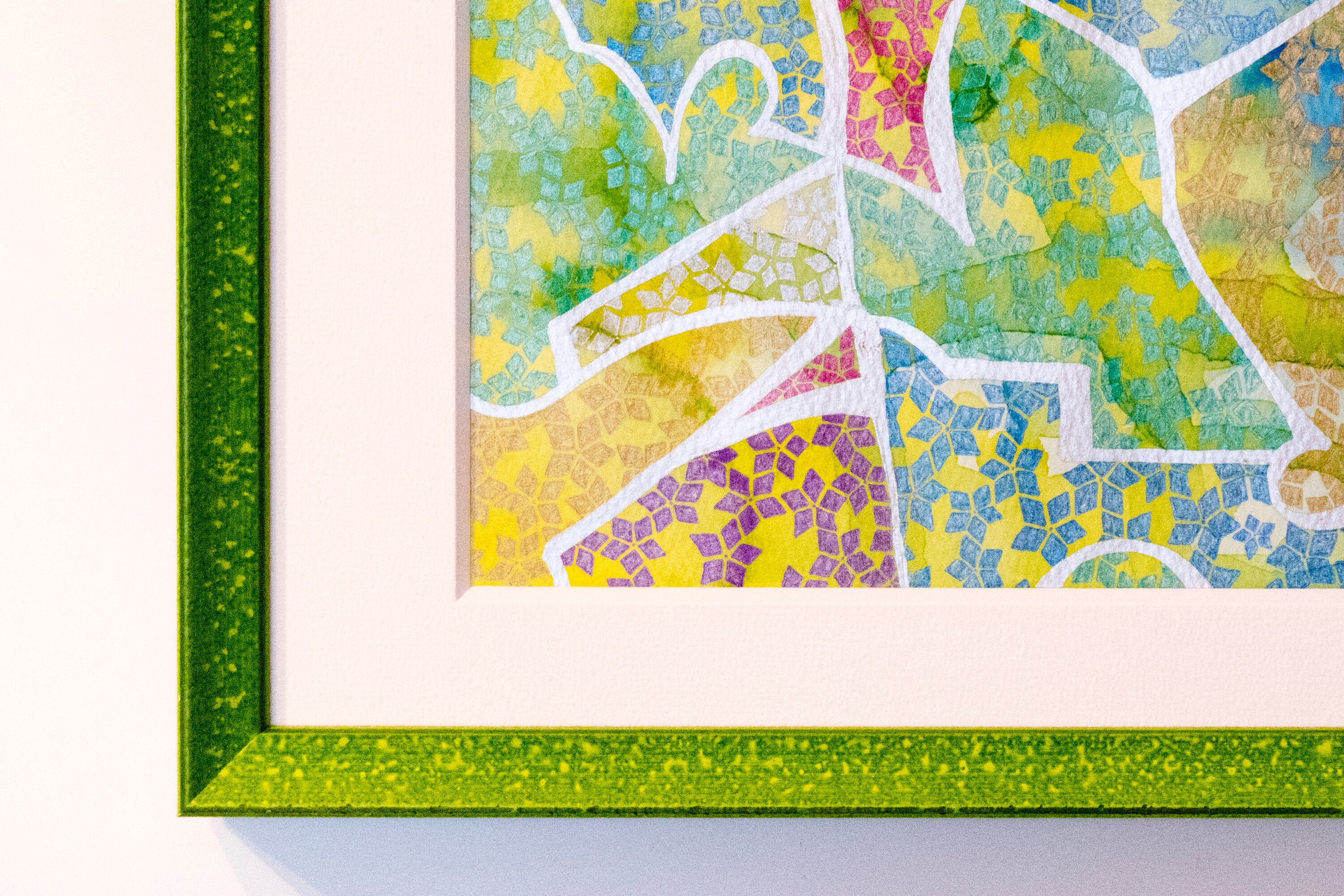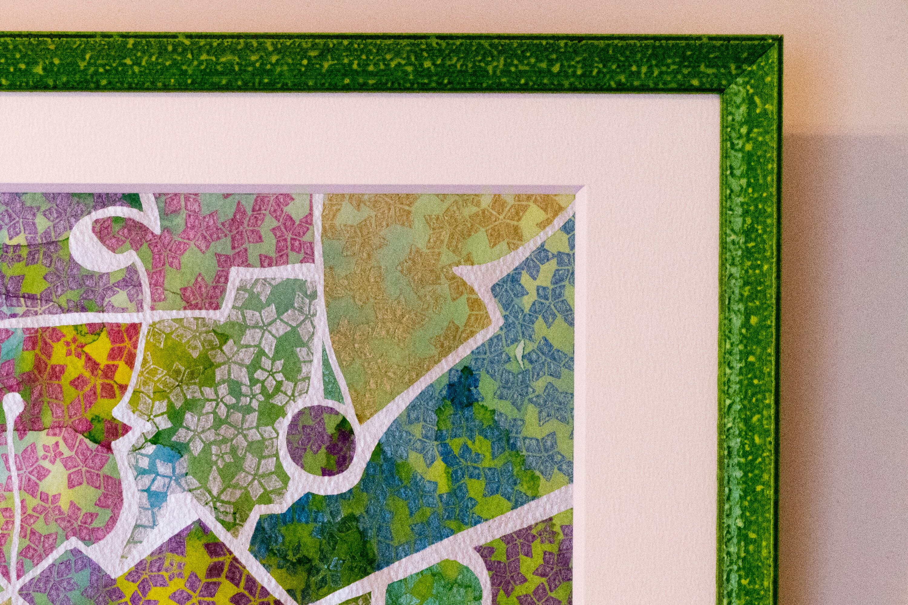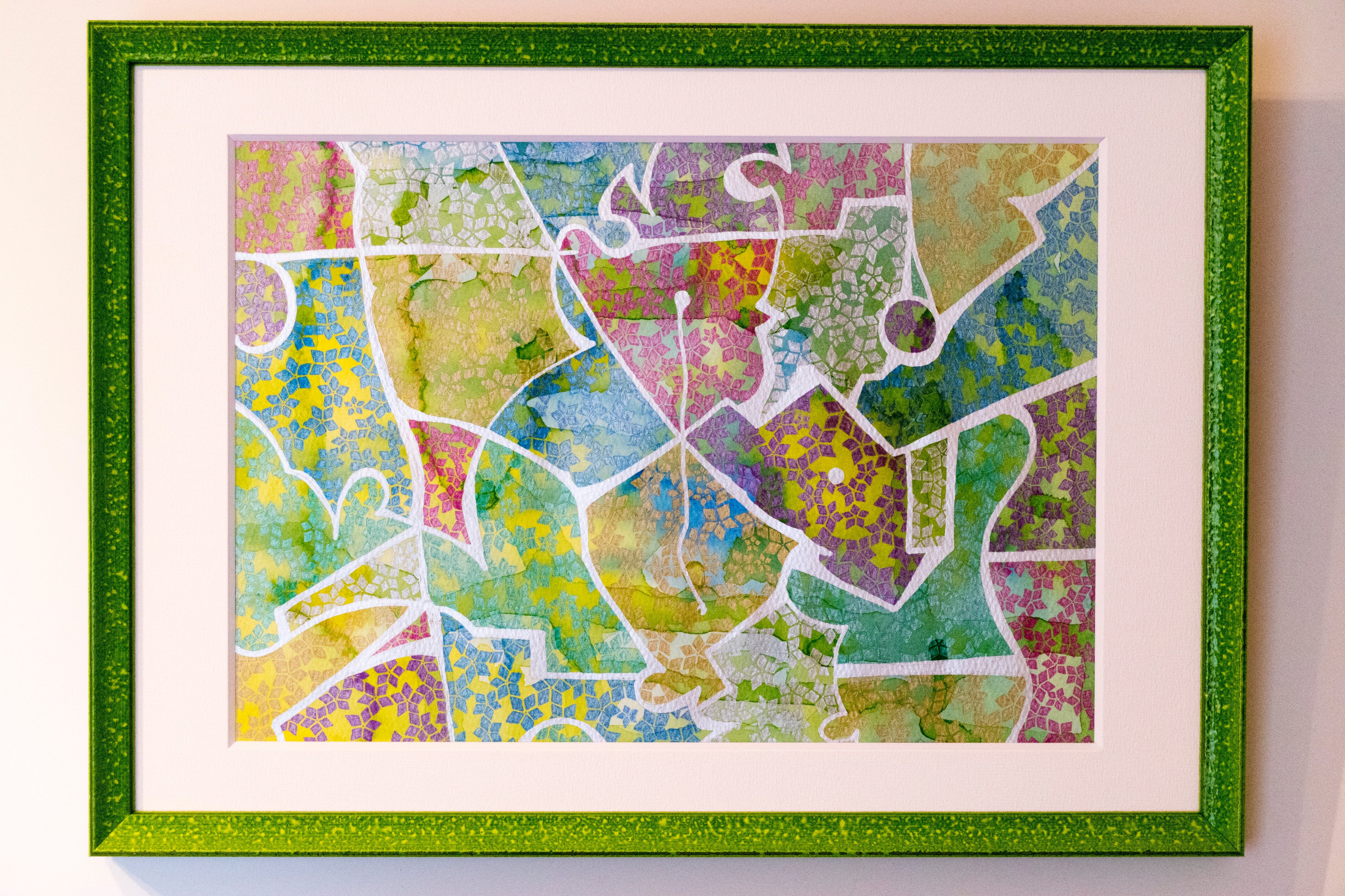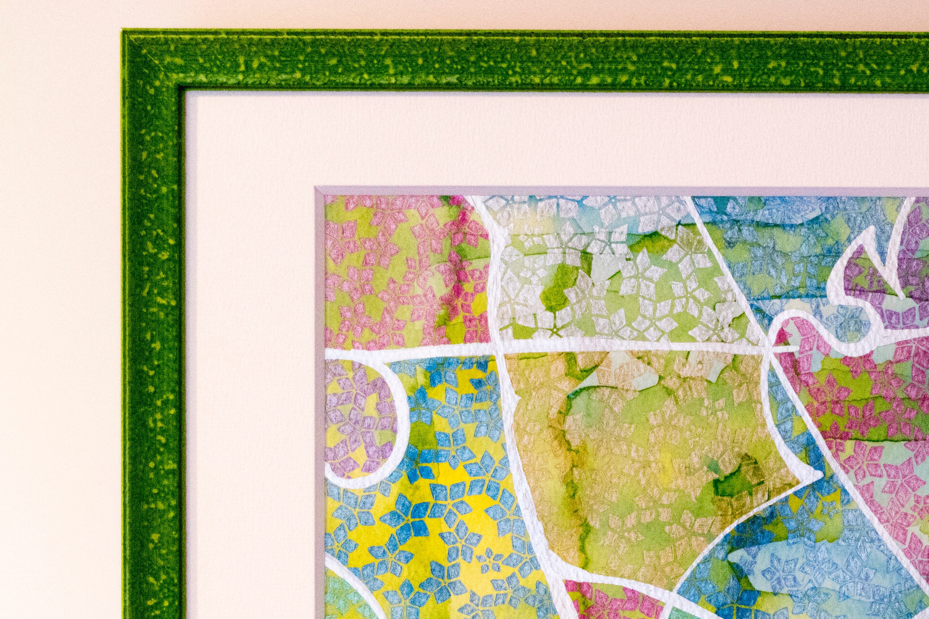 緑のフレームに額装した絵画は、場所を問わず、空間を彩ってくれると思います。
