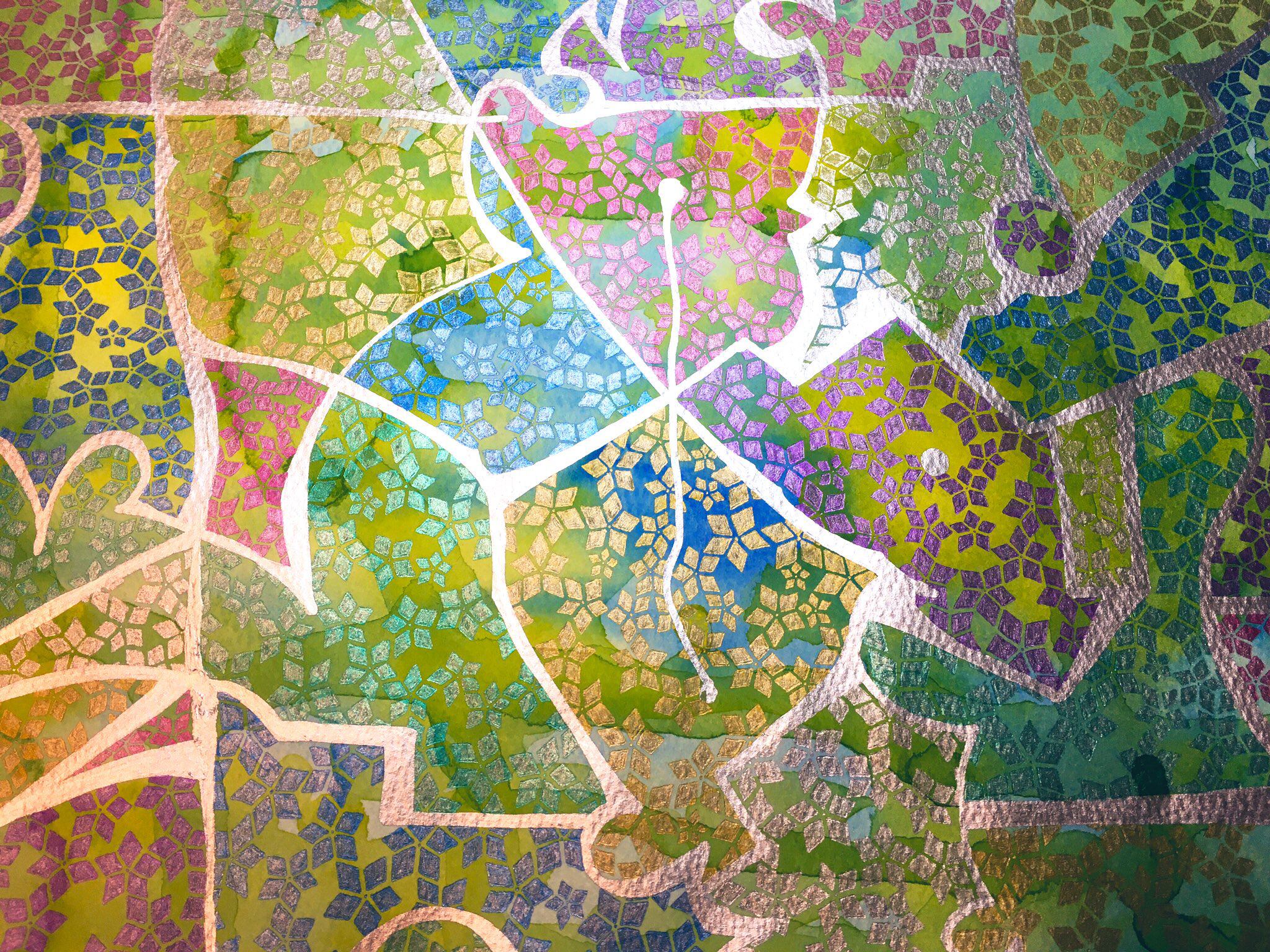 水彩で作った下地、油性インクによる面、色々に咲く花々。